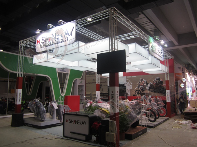 契合鑫源摩托的品牌形象和產(chǎn)品特性,采用矩形結(jié)構(gòu),再搭配燈具燈光的效果,襯托出展位簡約、時尚的氛圍,突出一種現(xiàn)代、簡約的時尚品味。