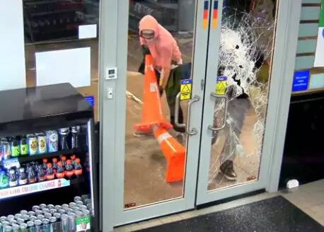 監(jiān)控錄像記錄了事發(fā)的整個(gè)過(guò)程:一開(kāi)始,兩個(gè)帶著作案工具的蒙面盜賊在用力敲擊加油站內(nèi)商店的玻璃門(mén),動(dòng)作十分兇狠。就在他們將要從被砸破的門(mén)洞中鉆進(jìn)室內(nèi)時(shí),商店的一角開(kāi)始噴發(fā)白色煙霧(仔細(xì)看下圖左上角)。