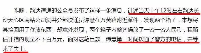 2月18日中午,長沙市洞井安置小區(qū)韻達快遞的員工譚慧在雨花區(qū)萬芙路長安郡小區(qū)二期門前馬路邊撿到一疊現(xiàn)金,給同在一個公司上班的堂哥譚某勝打電話開玩笑說撿到兩箱錢,估計有幾百萬。堂哥讓譚慧報警,但譚慧并沒有報警,也未告知真相,而是原地等待失主十分鐘左右后離開,去往洞井一小區(qū)與譚某勝匯合,并拿出撿到錢說是失主給的感謝費。經(jīng)清點,發(fā)現(xiàn)有1000元錢。當日下午,公司負責人之一陳某找其核實情況,并要求他問清處警的民警姓名,于是譚慧撥打110,但未說話。后來,因為面子因素和擔心被責怪一直沒說出實情,還編造出撿到四、五百萬并報警,有疑似特警人員處警辦理此事,并以此答復(fù)媒體。