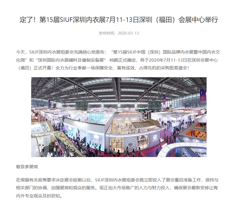 根據(jù)深圳內(nèi)衣展設(shè)計(jì)搭建公司領(lǐng)藝展覽了解到,SIUF深圳內(nèi)衣展組委會(huì)充滿(mǎn)信心地宣布:“第15屆SIUF中國(guó)(深圳)國(guó)際品牌內(nèi)衣展暨中國(guó)內(nèi)衣文化周”和“深圳國(guó)際內(nèi)衣面輔料及縫制設(shè)備展” 檔期正式確定,將于2020年7月11-13日在深圳會(huì)展中心(福田)正式開(kāi)幕!全力為行業(yè)奉獻(xiàn)一場(chǎng)保障安全、富有成效、占得先機(jī)的采購(gòu)貿(mào)易盛會(huì)!如需深圳內(nèi)衣展設(shè)計(jì)請(qǐng)聯(lián)系領(lǐng)藝展覽,希望我們能在深圳內(nèi)衣展搭建上為您添磚加瓦,祝各位朋友收獲多多,滿(mǎn)載而歸!