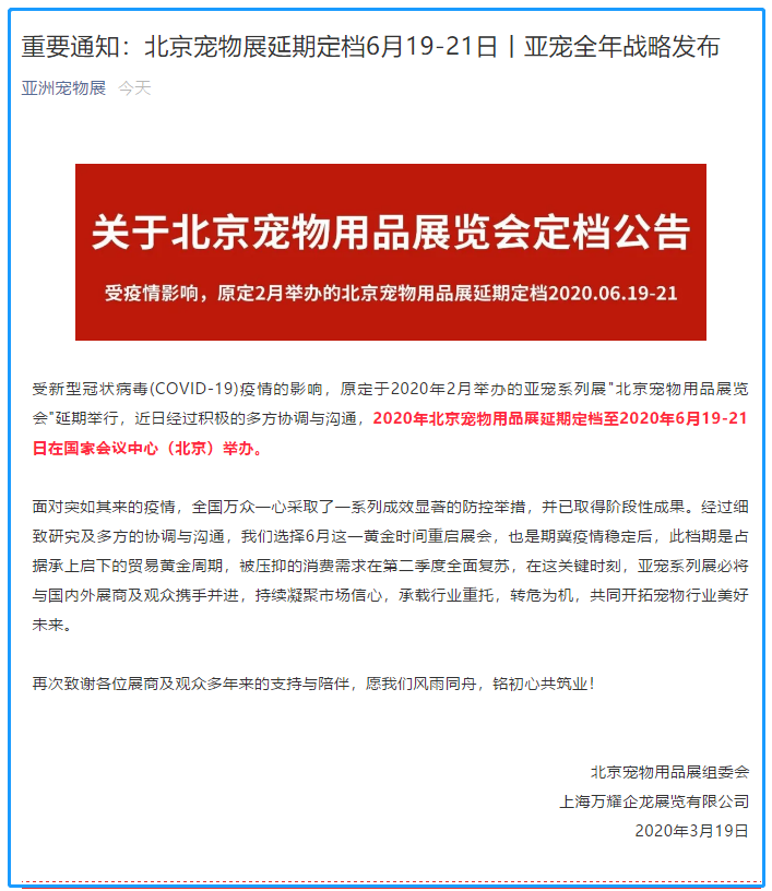 根據(jù)寵物展設(shè)計搭建公司領(lǐng)藝展覽了解到,原定于2020年2月舉辦的亞寵系列展"北京寵物用品展覽會"延期舉行,近日經(jīng)過積極的多方協(xié)調(diào)與溝通,2020年北京寵物用品展延期定檔至2020年6月19-21日在國家會議中心(北京)舉辦。如需寵物展展會設(shè)計請聯(lián)系領(lǐng)藝展覽,希望我們能在寵物展搭建上為您添磚加瓦,祝各位朋友收獲多多,滿載而歸!