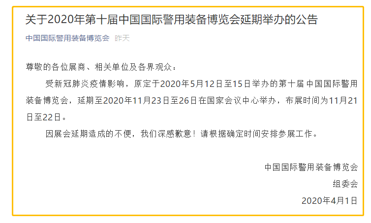 根據(jù)警博會設計搭建公司領藝展覽了解到,受新冠肺炎疫情影響,原定于2020年5月12日至15日舉辦的第十屆中國國際警用裝備博覽會,延期至2020年11月23日至26日在國家會議中心舉辦,布展時間為11月21日至22日。如需警博會設計請聯(lián)系領藝展覽,希望我們能在警博會搭建上為您添磚加瓦,祝各位朋友收獲多多,滿載而歸!