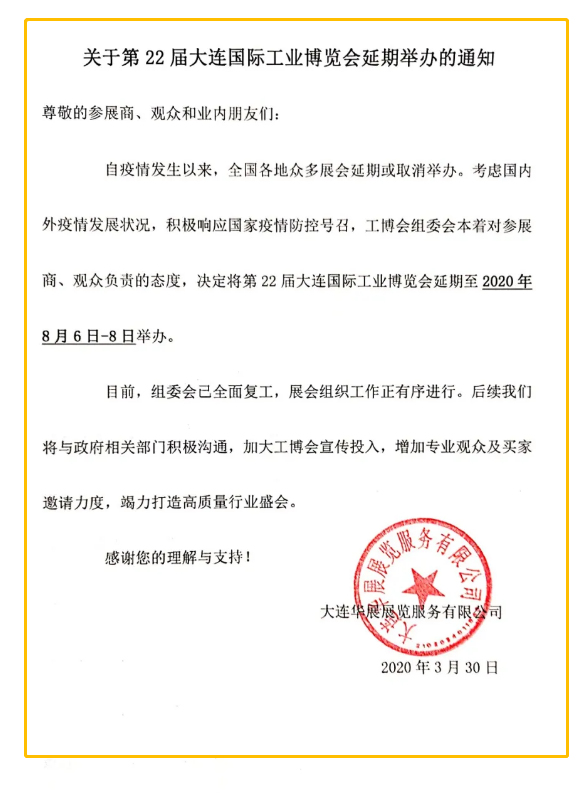 根據(jù)工博會設(shè)計搭建公司領(lǐng)藝展覽了解到,受疫情影響,第22屆大連國際工業(yè)博覽會延期舉辦,時間確定為2020年8月6日 —8日。如需工博會設(shè)計請聯(lián)系領(lǐng)藝展覽,希望我們能在工博會搭建上為您添磚加瓦,祝各位朋友收獲多多,滿載而歸!