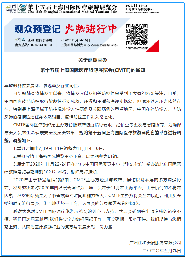 上海醫(yī)療展設計搭建公司領藝展覽了解到,CMTF國際醫(yī)療旅游展主辦方遵照政府防疫指導要求,經慎重考慮及與展館協商,為確保與會人員的生命健康安全及展會效果,現將第十五屆上海國際醫(yī)療旅游展覽會的舉辦進行調整,舉辦時間由7月9日-11日調整為11月14-16日。如需展會設計請聯系領藝展覽,希望我們能在上海醫(yī)療展搭建上為您添磚加瓦,祝各位朋友收獲多多,滿載而歸!