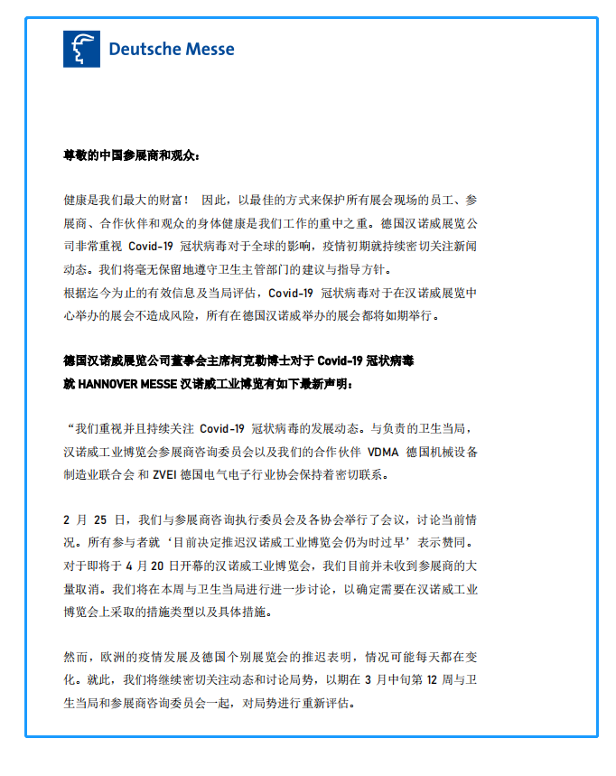 根據(jù)深圳工博會展臺設(shè)計公司領(lǐng)藝展覽了解到,德國漢諾威展覽公司非常重視Covid-19冠狀病毒對于全球的影響,疫情初期就持續(xù)密切關(guān)注新聞動態(tài)。我們將毫無保留地遵守衛(wèi)生主管部門的建議與指導(dǎo)方針。根據(jù)迄今為止的有效信息及當(dāng)局評估,Covid-19冠狀病毒對于在漢諾威展覽中心舉辦的展會不造成風(fēng)險,所有在德國漢諾威舉辦的展會都將如期舉行。如需深圳工博會展位設(shè)計裝修請聯(lián)系領(lǐng)藝展覽,希望我們能在深圳工博會布展搭建上為您添磚加瓦,祝各位朋友收獲多多,滿載而歸!
