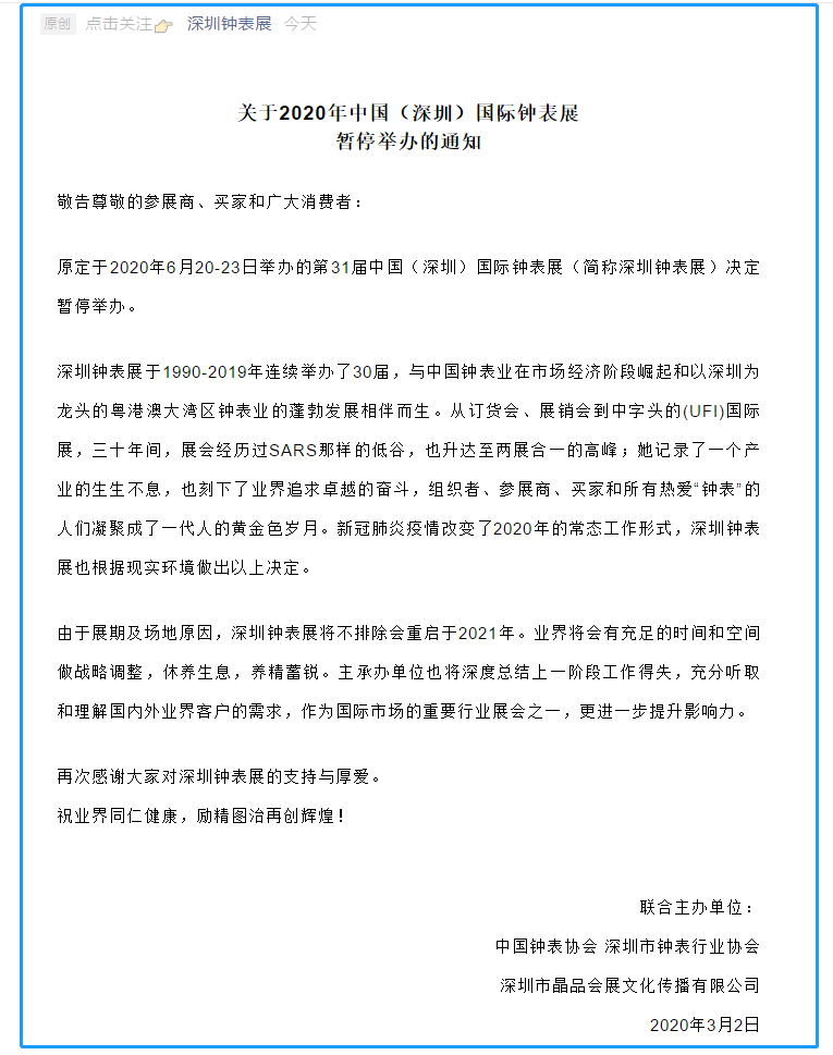 根據(jù)深圳展臺設(shè)計搭建公司領(lǐng)藝展覽了解到,原定于2020年6月20-23日舉辦的第31屆中國(深圳)國際鐘表展(簡稱深圳鐘表展)決定暫停舉辦。如需深圳展臺設(shè)計請聯(lián)系領(lǐng)藝展覽,希望我們能在深圳展會搭建上為您添磚加瓦,祝各位朋友收獲多多,滿載而歸!