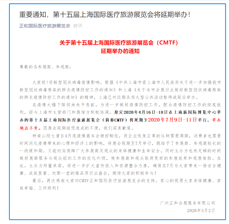 根據(jù)上海醫(yī)療展設(shè)計(jì)搭建公司領(lǐng)藝展覽了解到,原定2020年4月16日-18日在上海新國際博覽中心舉辦的第十五屆上海國際醫(yī)療旅游展覽會(簡稱CMTF)將延期至2020年7月9日-11日舉行,舉辦地點(diǎn)不變。如需上海醫(yī)療展設(shè)計(jì)請聯(lián)系領(lǐng)藝展覽,希望我們能在上海醫(yī)療展搭建上為您添磚加瓦,祝各位朋友收獲多多,滿載而歸!