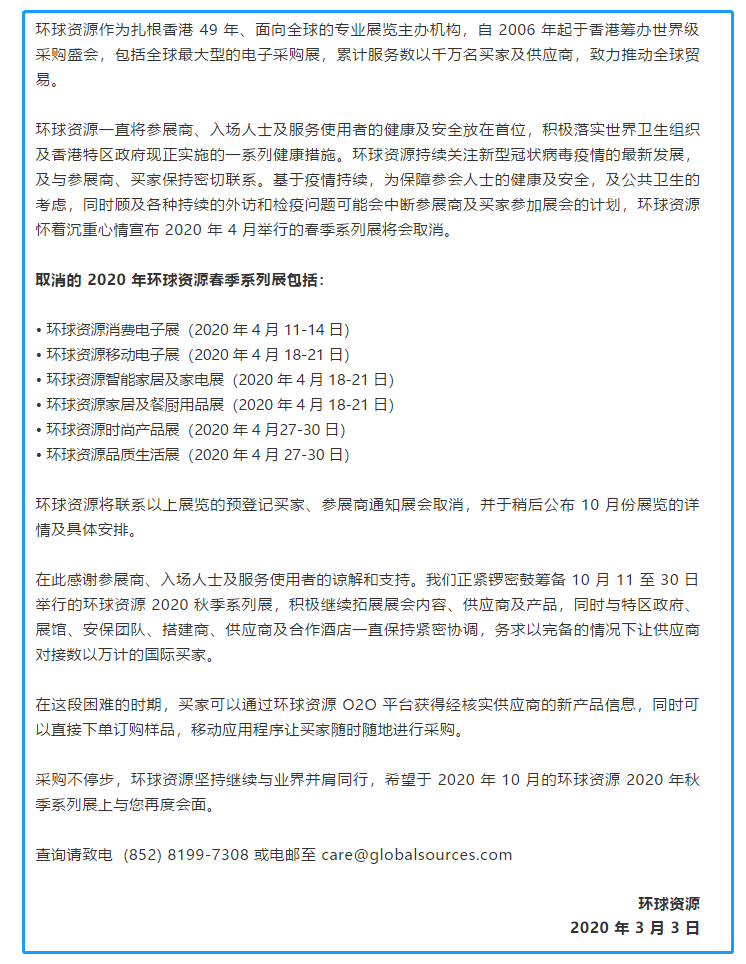 根據(jù)環(huán)球資源展設(shè)計(jì)搭建公司領(lǐng)藝展覽了解到,環(huán)球資源作為扎根香港 49 年、面向全球的專業(yè)展覽主辦機(jī)構(gòu),自 2006 年起于香港籌辦世界級采購盛會,包括全球最大型的電子采購展,累計(jì)服務(wù)數(shù)以千萬名買家及供應(yīng)商,致力推動全球貿(mào)易?;谝咔槌掷m(xù),為保障參會人士的健康及安全,及公共衛(wèi)生的考慮,同時(shí)顧及各種持續(xù)的外訪和檢疫問題可能會中斷參展商及買家參加展會的計(jì)劃,環(huán)球資源懷著沉重心情宣布 2020 年 4 月舉行的春季系列展將會取消。環(huán)球資源將聯(lián)系展覽的預(yù)登記買家、參展商通知展會取消,并于稍后公布 10 月份展覽的詳情及具體安排。如需環(huán)球資源展展臺設(shè)計(jì)請聯(lián)系領(lǐng)藝展覽,希望我們能在環(huán)球資源展展臺搭建上為您添磚加瓦,祝各位朋友收獲多多,滿載而歸!