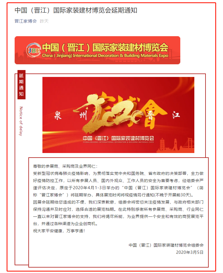 根據(jù)家博會設計搭建公司領藝展覽了解到,原定于2020年4月1-3日舉辦的“中國(晉江)國際家裝建材博覽會”(簡稱“晉江家博會”)將延期舉辦,具體展覽時間將視疫情另行通知(不晚于開展前30天)。如需家博會展臺設計請聯(lián)系領藝展覽,希望我們能在家博會展臺搭建上為您添磚加瓦,祝各位朋友收獲多多,滿載而歸!