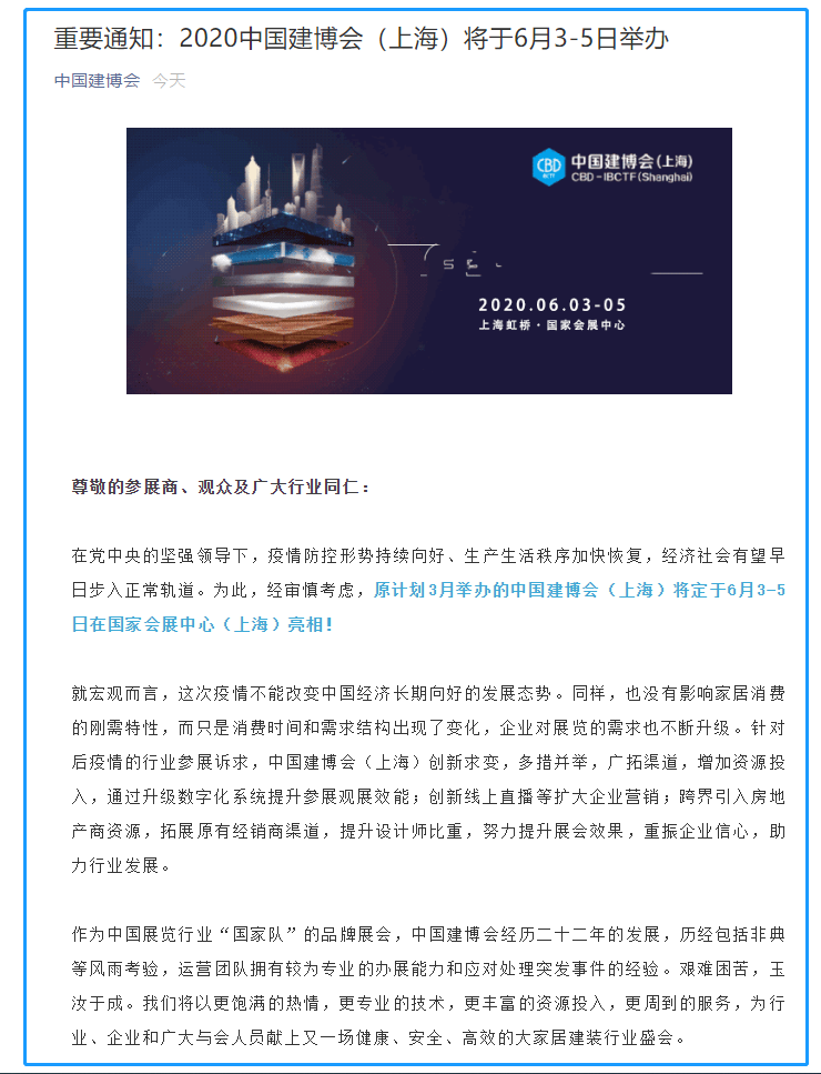 根據(jù)上海建博會(huì)設(shè)計(jì)搭建公司領(lǐng)藝展覽了解到,原計(jì)劃3月舉辦的中國(guó)建博會(huì)(上海)將定于6月3-5日在國(guó)家會(huì)展中心(上海)亮相!全力為行業(yè)奉獻(xiàn)一場(chǎng)保障安全、富有成效、占得先機(jī)的采購(gòu)貿(mào)易盛會(huì)!如需上海建博會(huì)設(shè)計(jì)請(qǐng)聯(lián)系領(lǐng)藝展覽,希望我們能在上海建博會(huì)搭建上為您添磚加瓦,祝各位朋友收獲多多,滿載而歸!