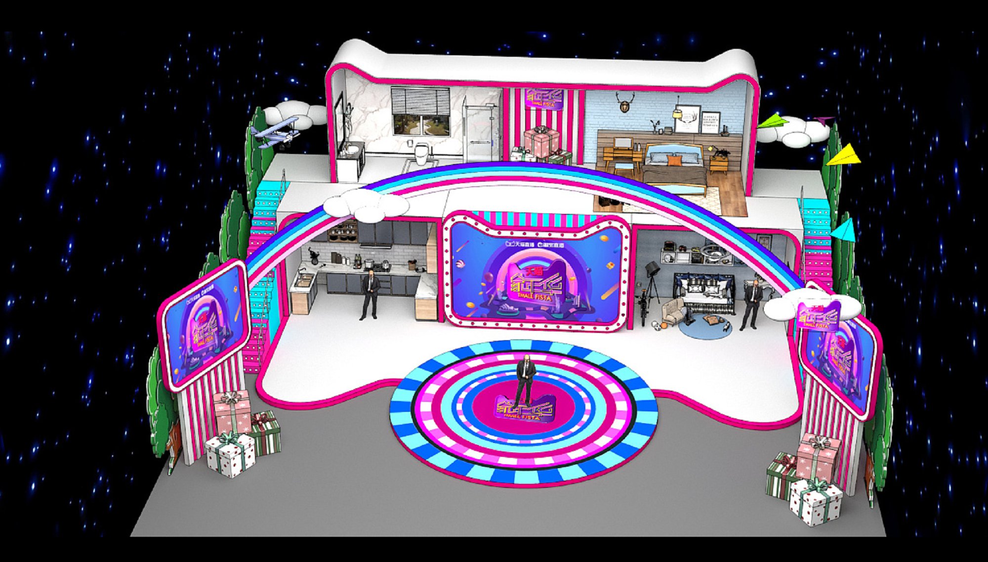 契合天貓的品牌形象和產(chǎn)品特性,采用開放式結(jié)構(gòu),再搭配燈具燈光的效果,襯托出直播間大氣、豪華的氛圍,突出一種簡約、時(shí)尚的品味。
